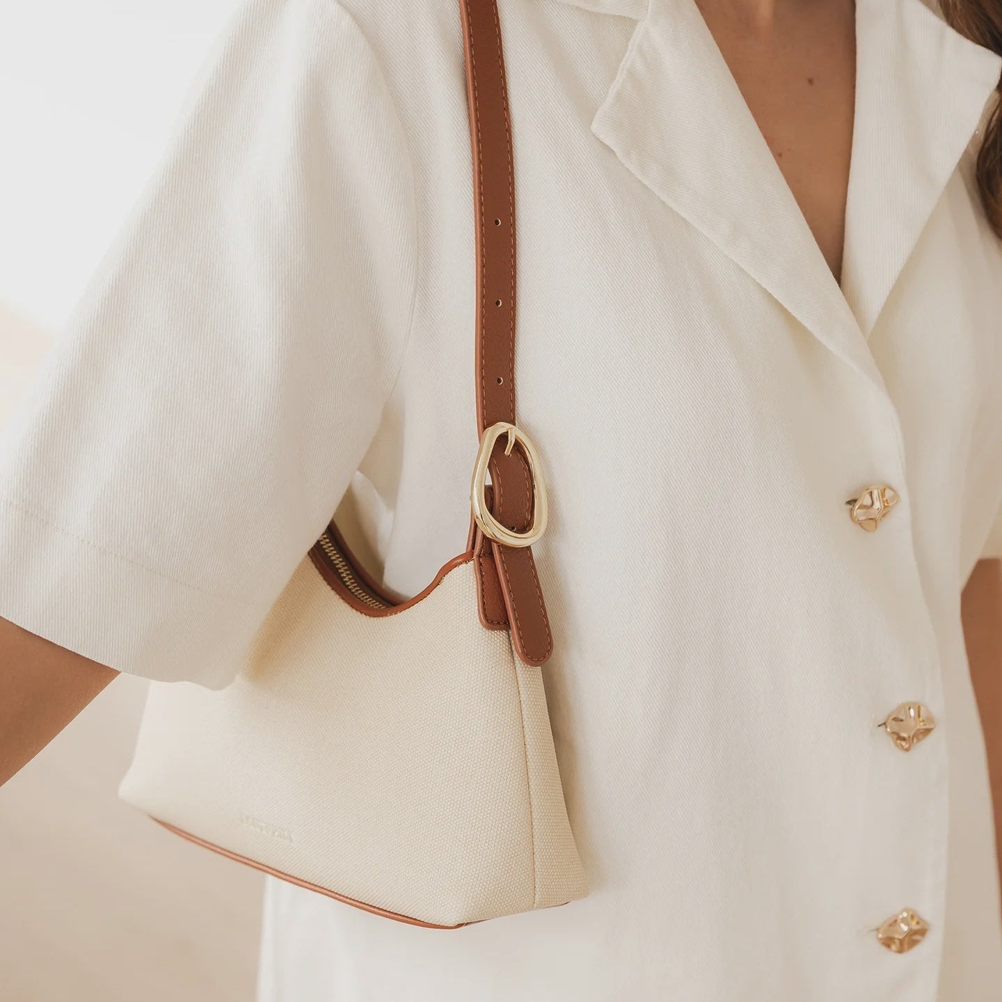 Elevate her everyday style with the Amelia Canvas Tan Shoulder Bag—a minimalist yet eye-catching accessory designed to make a statement. Defined by its clean lines and unique asymmetrical structured silhouette, this bag blends modern elegance with practical functionality. Whether she's heading to brunch, a casual outing, or a formal dinner, Amelia offers versatile sophistication that effortlessly transitions from day to night.