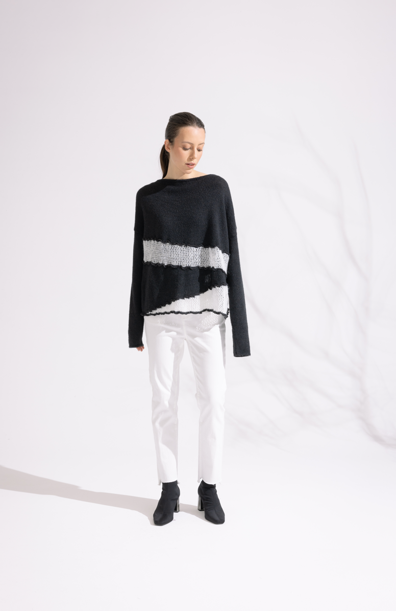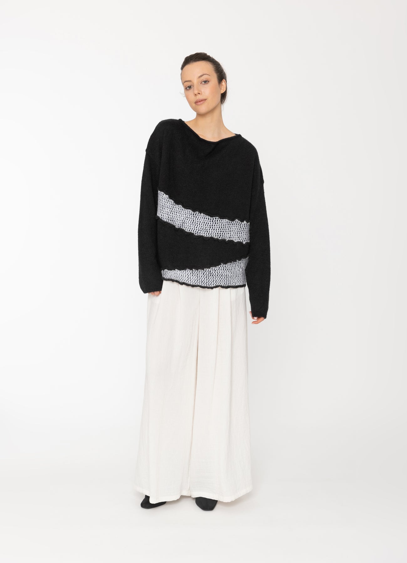 Person wearing a black and white sweater with white pants on a white background
