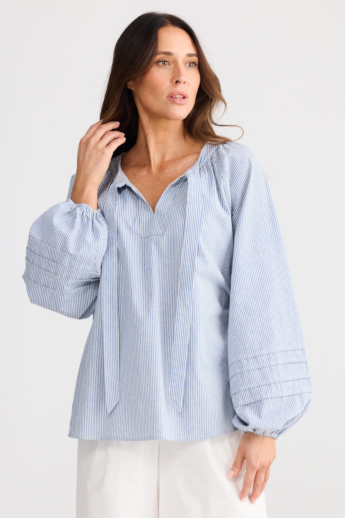 Add timeless sophistication to your wardrobe with the Brave & True Pinstripe Mardi Blouse. Crafted from 100% cotton, this relaxed-fit blouse features a V neckline with neck ties, delicate pintuck details, and soft gathers at the back, making it perfect for workwear, casual outings, or layered styling.