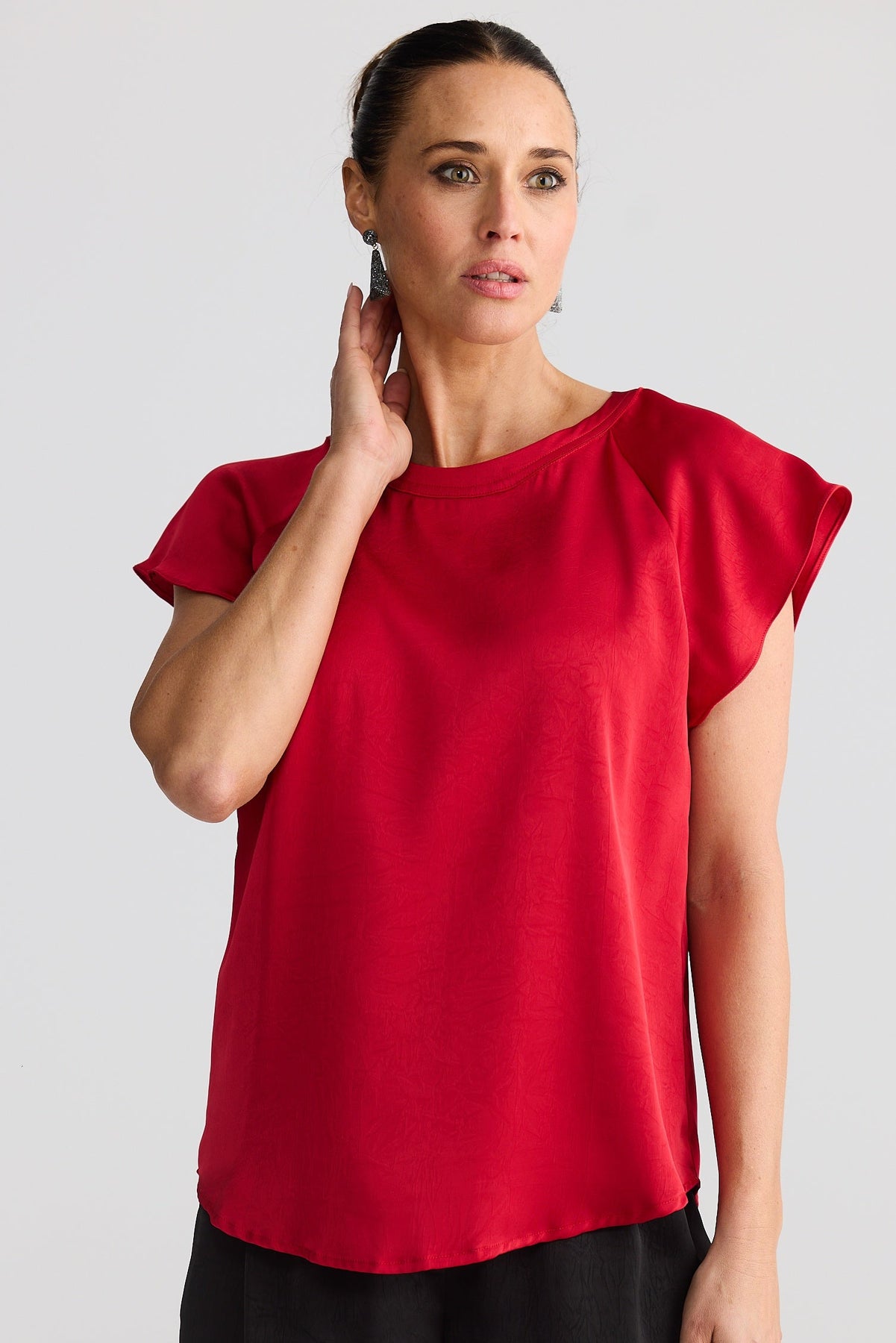 Woman wearing a red top and black shorts on a plain background