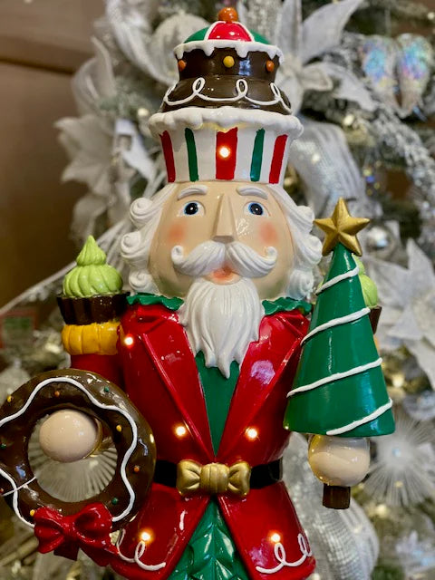 - Design: Classic nutcracker figure in candy-themed colors, holding a festive wreath