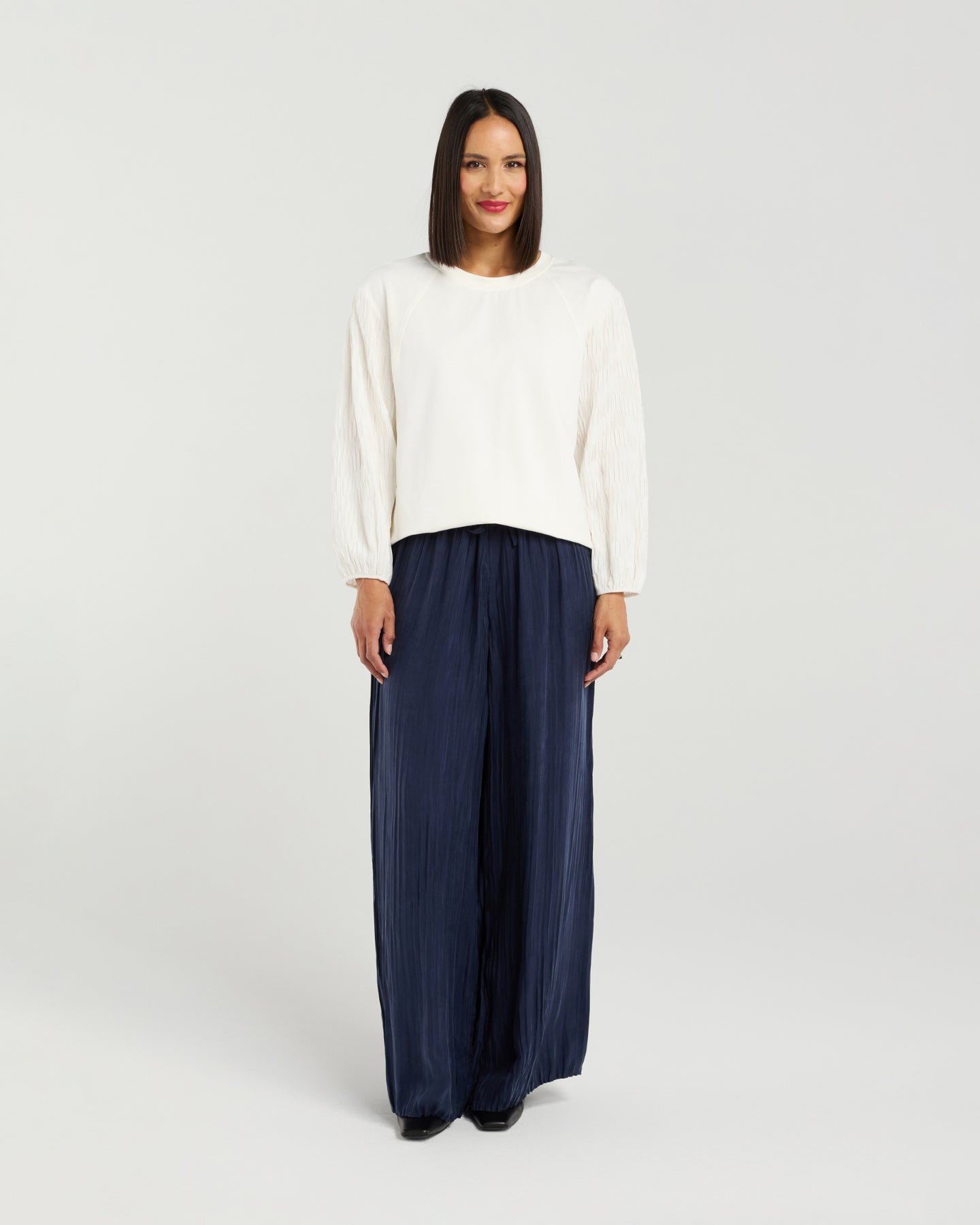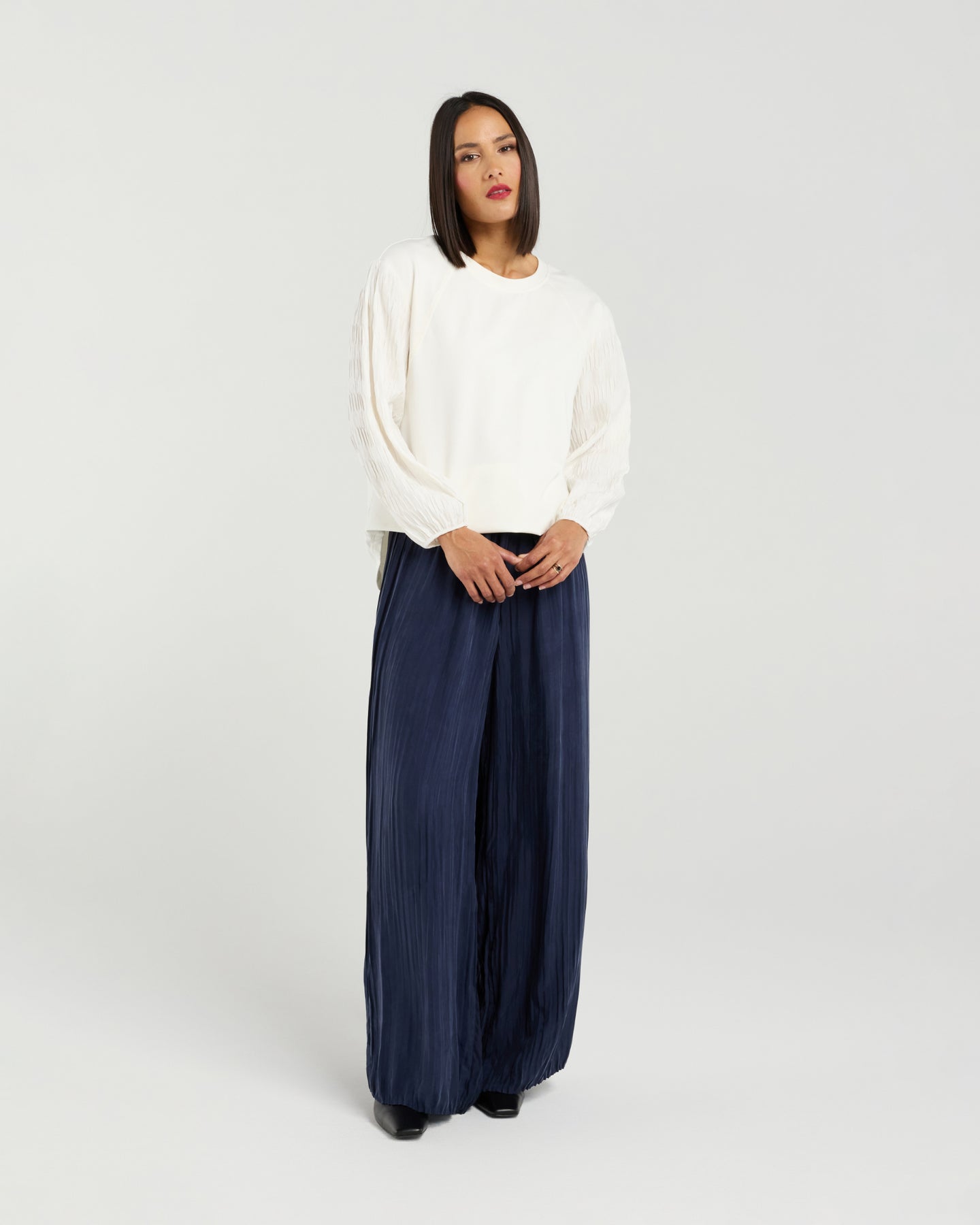 The standout feature of the Sienna Top is its statement sleeves, which are micro-pleated to create texture and movement, adding a playful edge to the overall design. This thoughtful detail sets it apart from ordinary tops, elevating it to a true fashion statement.