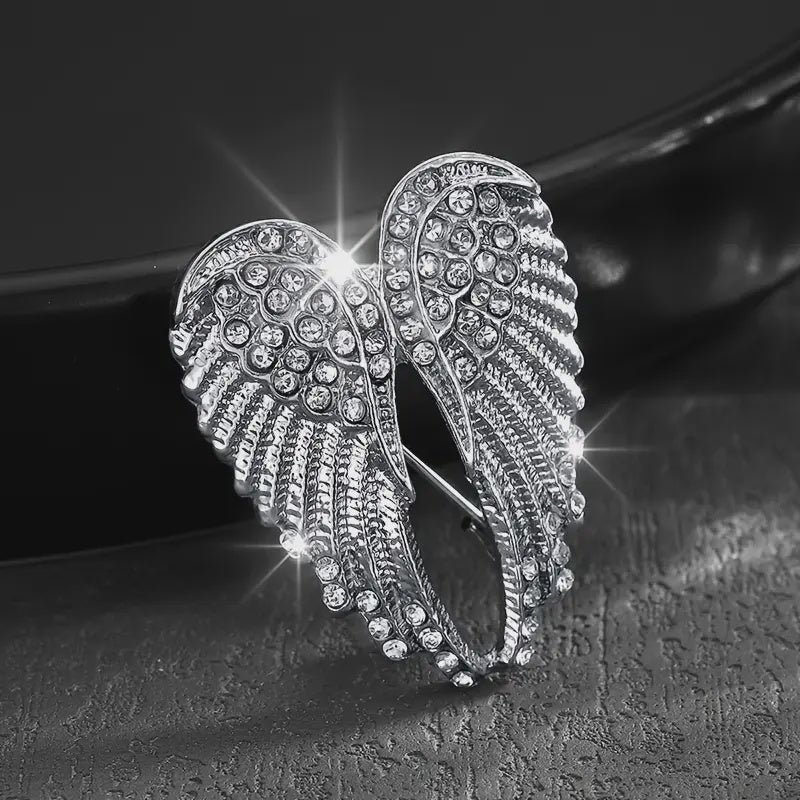 Enhance your ensemble with this divine angel wings brooch. Its delicate sparkle and meaningful design make it an inspiring accessory that adds a subtle touch of heavenly beauty to any outfit.