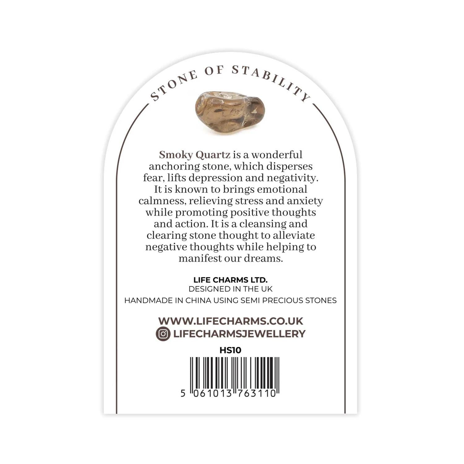 Smoky quartz bracelet on a branded card with 'Life Charms' branding.