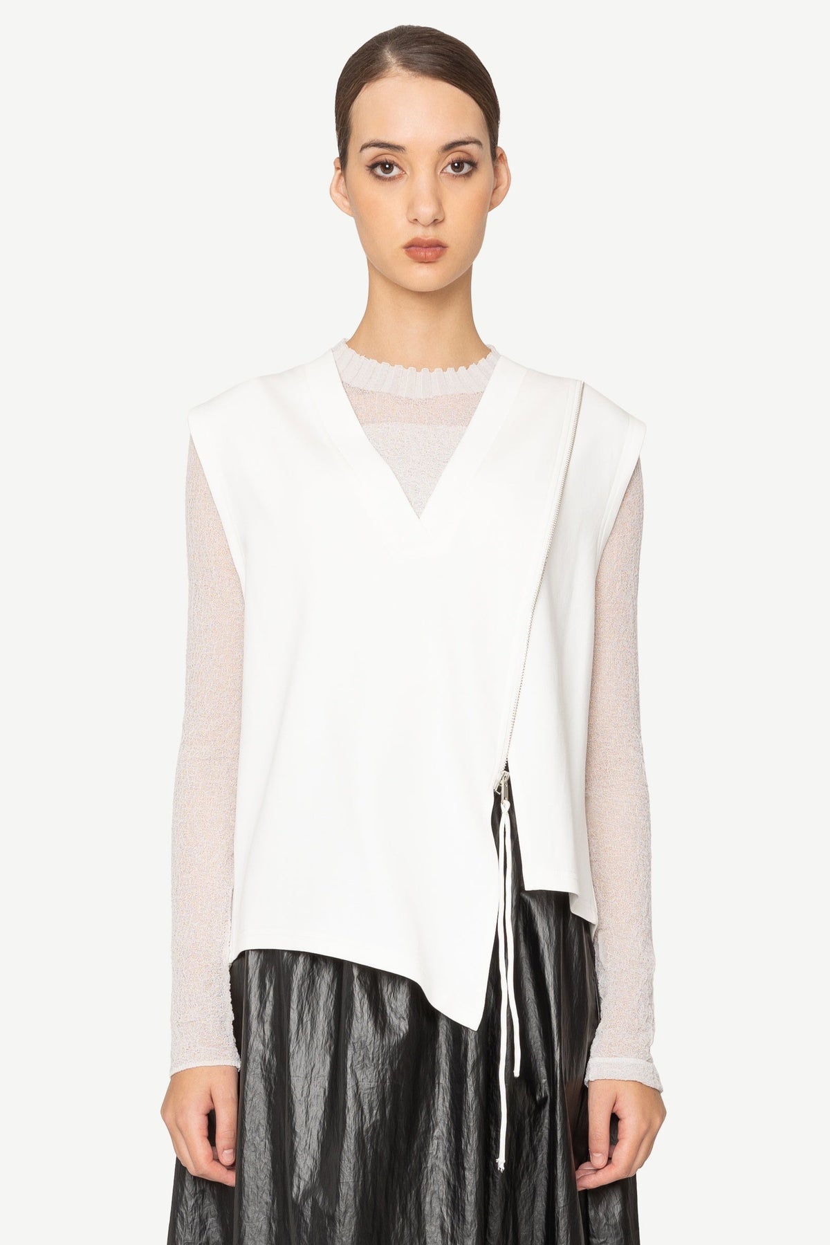 Introducing the Bone & Arrow Jax Vest in white, a striking asymmetrical piece designed to elevate your layering game with a touch of designer flair.