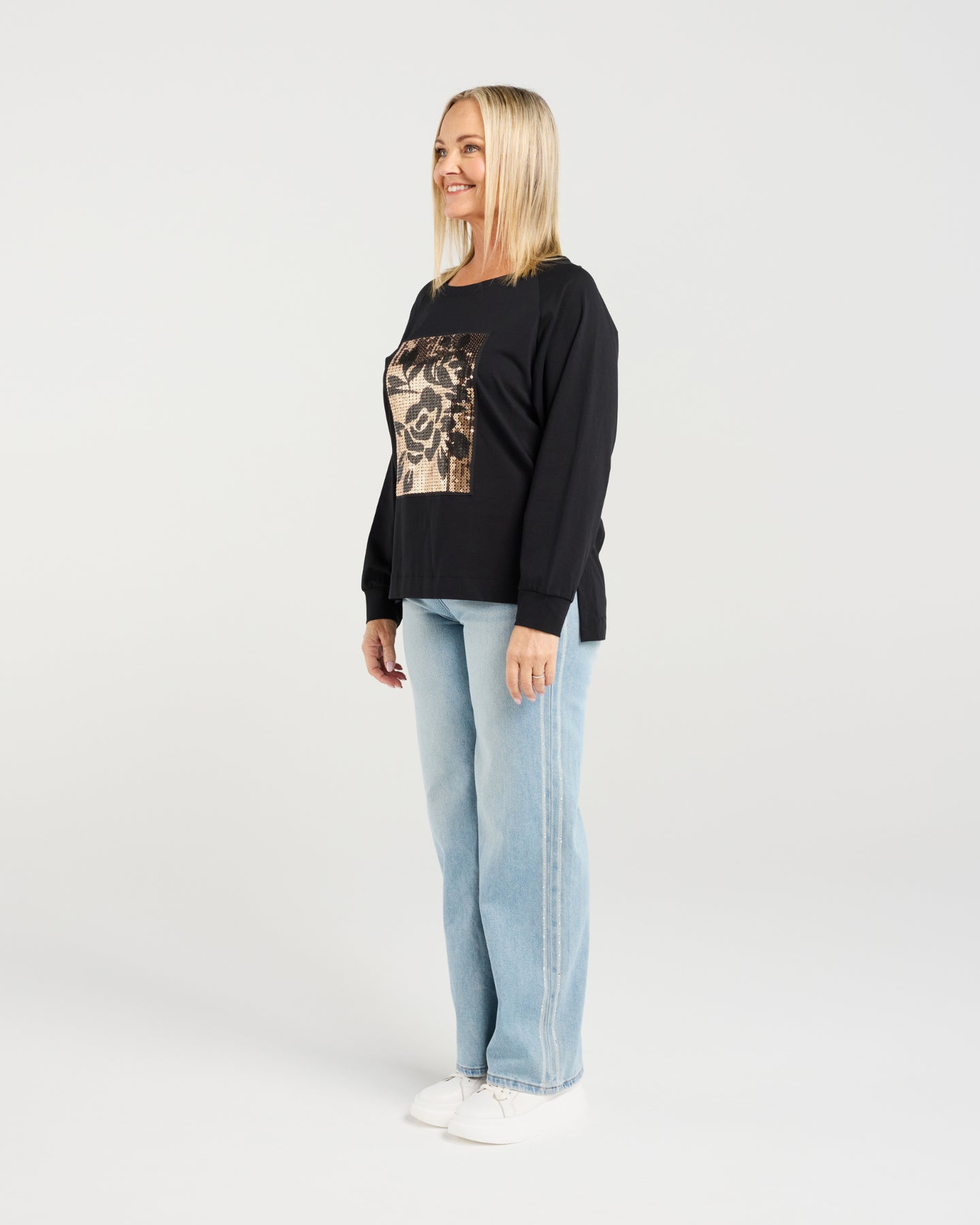 A striking winter staple in classic black, the Zafina Calla Top pairs a clean round neckline with a bold square sequin floral print for refined sparkle. The effortless silhouette transitions seamlessly from casual days to dressed-up evenings.