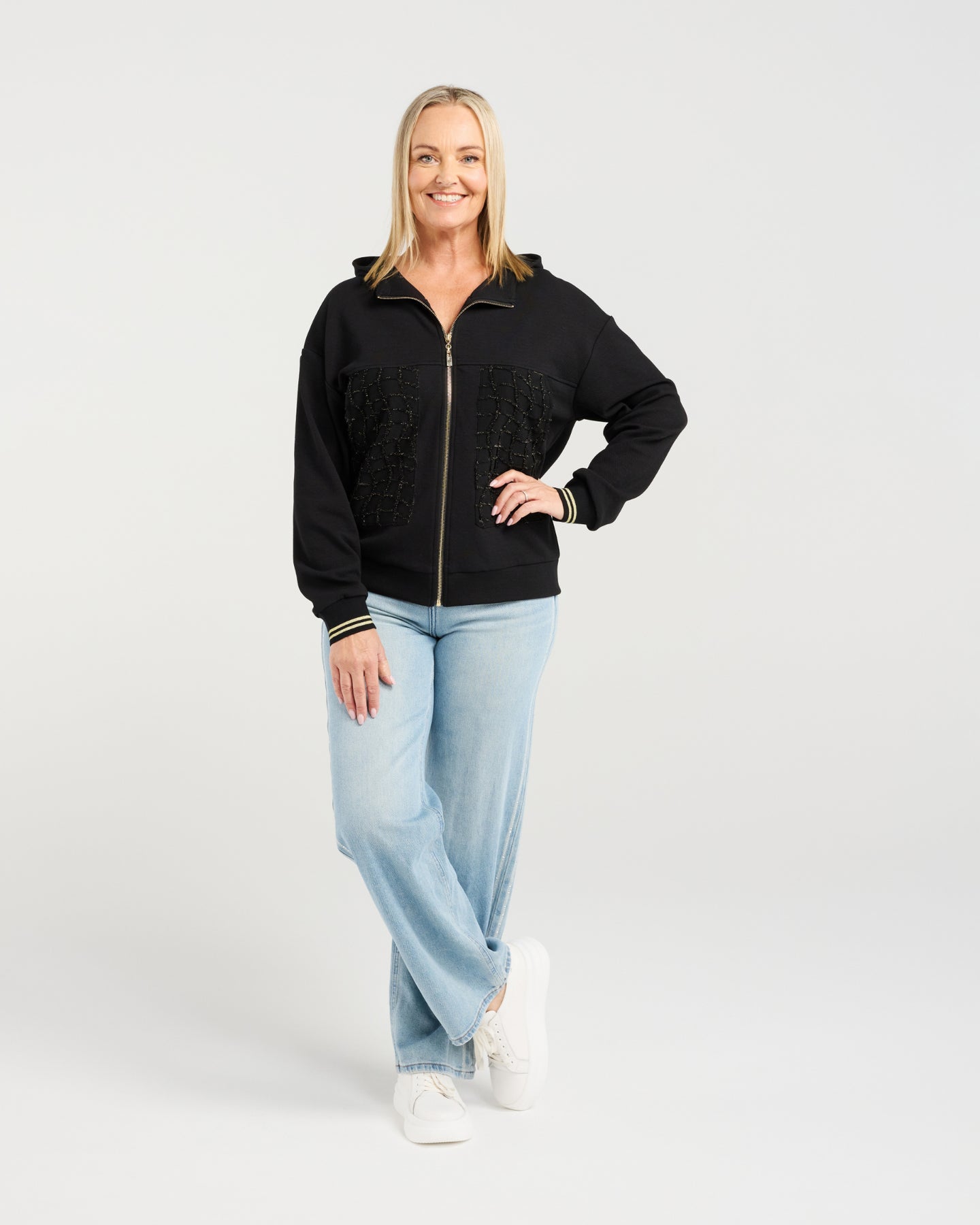 Woman wearing a black hoodie and light blue jeans on a white background