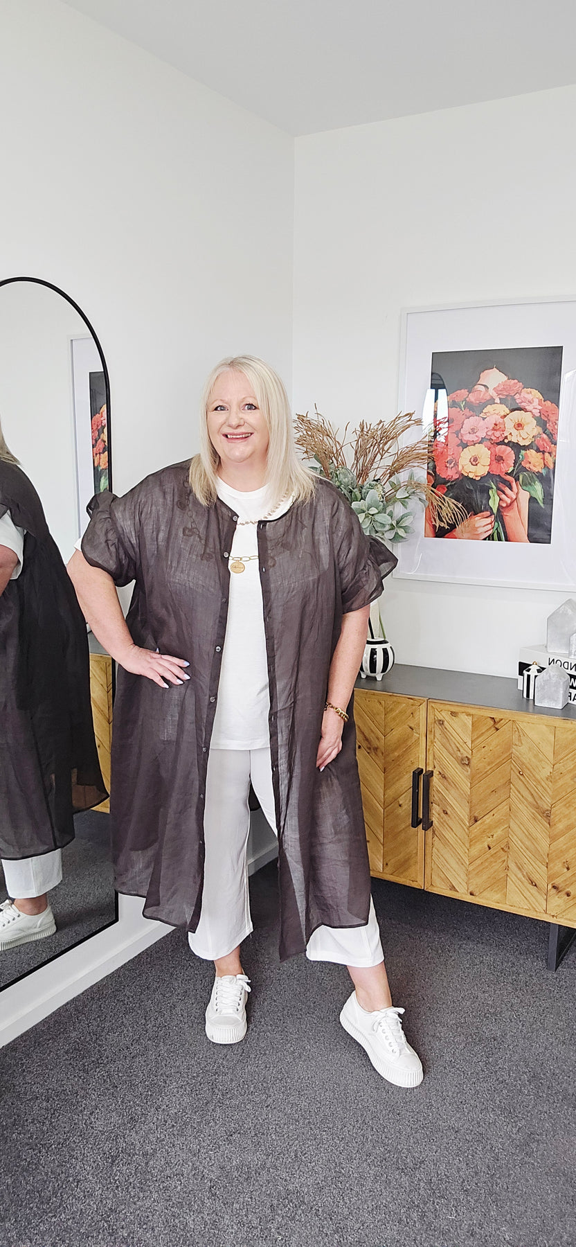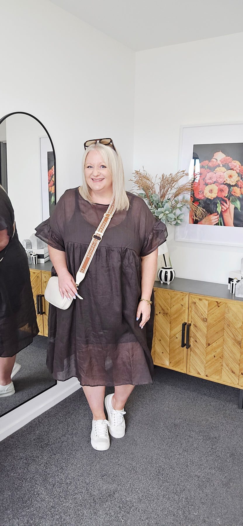 This baby-doll dress style is perfect for all body shapes with a strong empire line and lovely detailed sleeves. the dress gathers on the empire line allowing for a lovely full skirt that drops just under the bust. Made from a Rami fabric (linen) this dress is sheer so pop a slip on underneath but this could also be styled as a duster and worn back to front. The back features a button closure that could easily be spun around to work on the front.