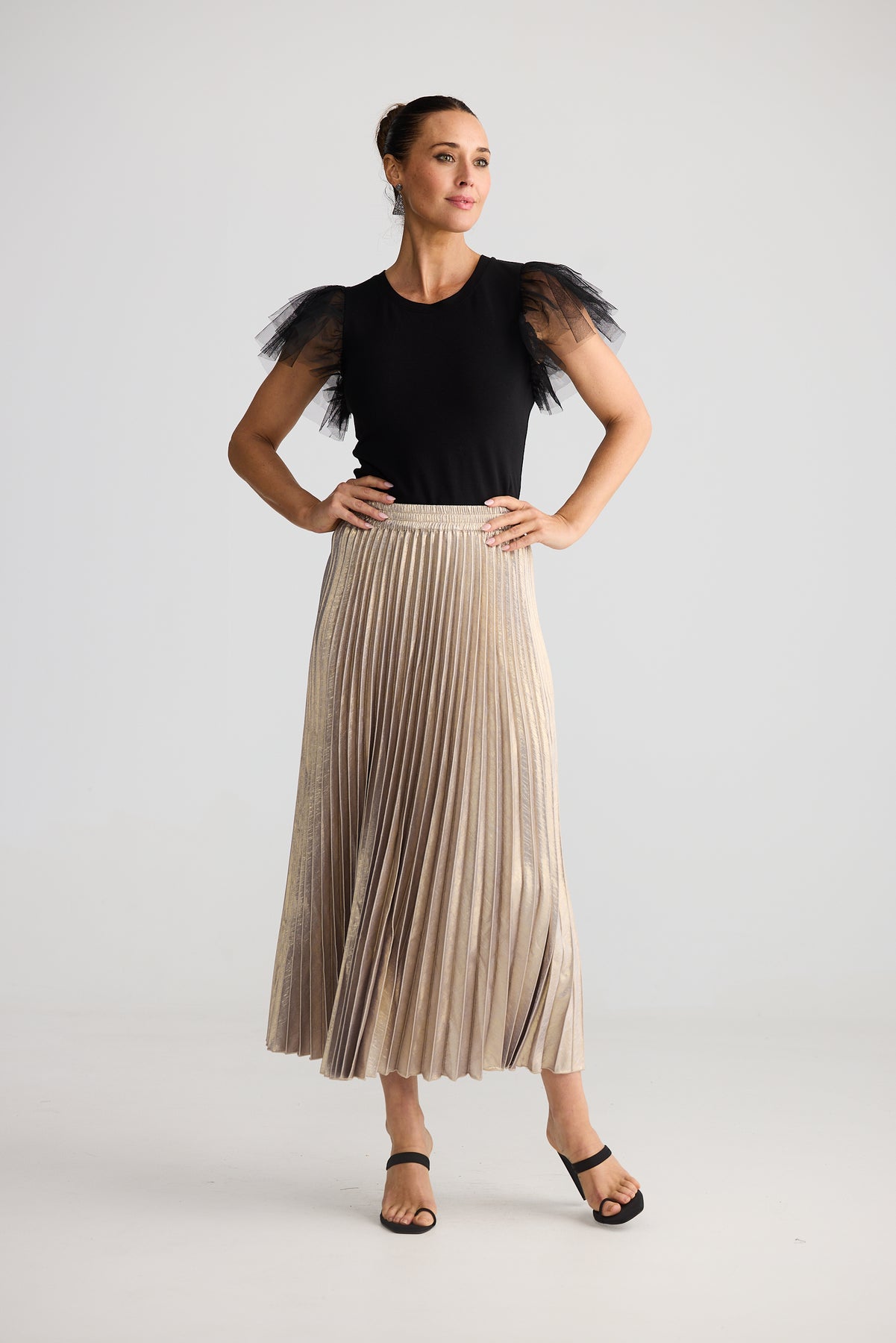 Woman wearing a black top and pleated metallic brave & true alias skirt on a white background