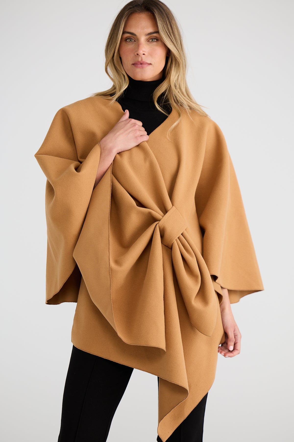 Elevate your outerwear collection with the Brave & True Camel Julianne Wrap. This versatile piece works beautifully over casual ensembles or dresses up any look, making it a must-have layering option for any season.