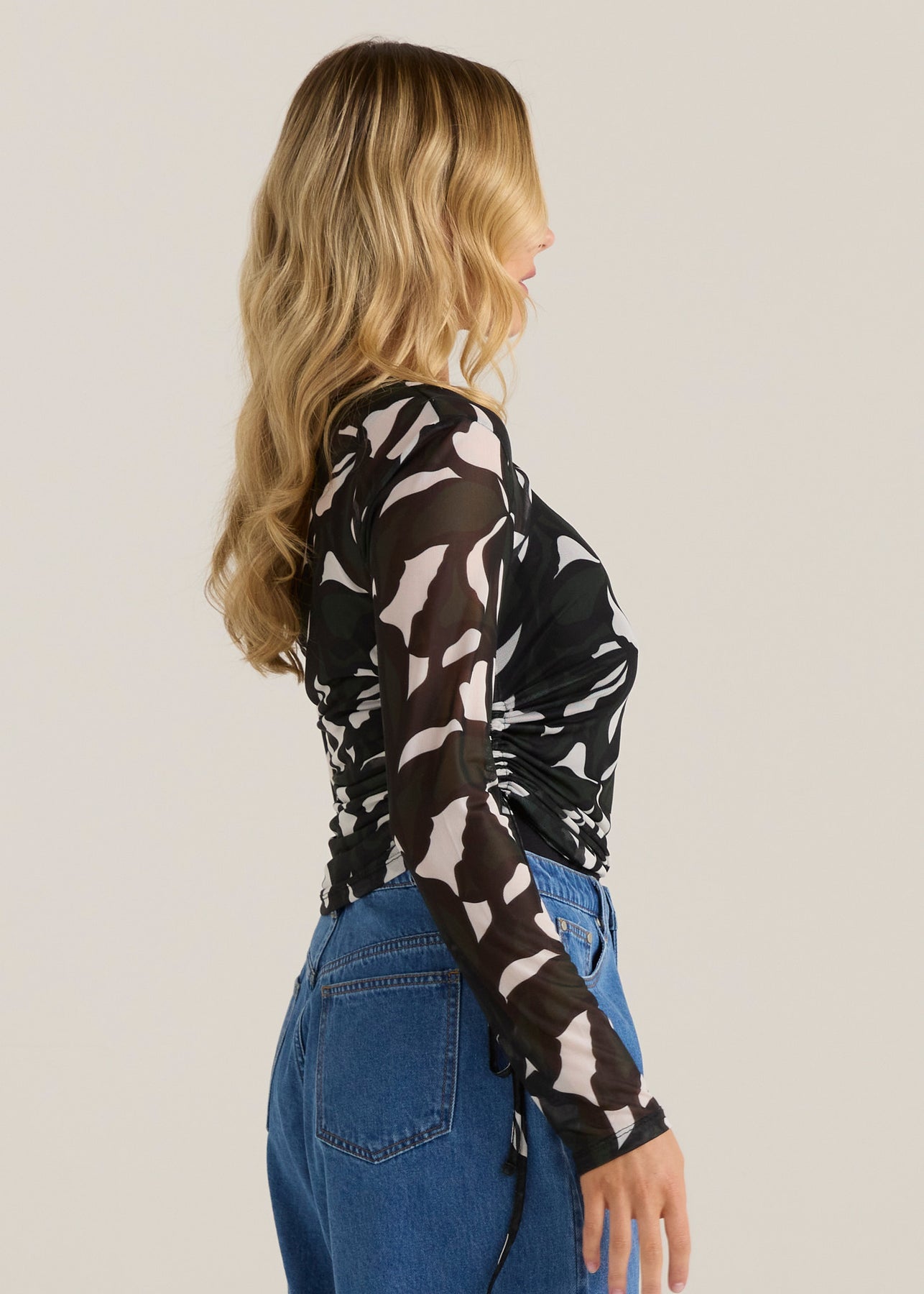 Woman wearing a FATE & BECKER patterned mesh top and blue jeans against a plain background