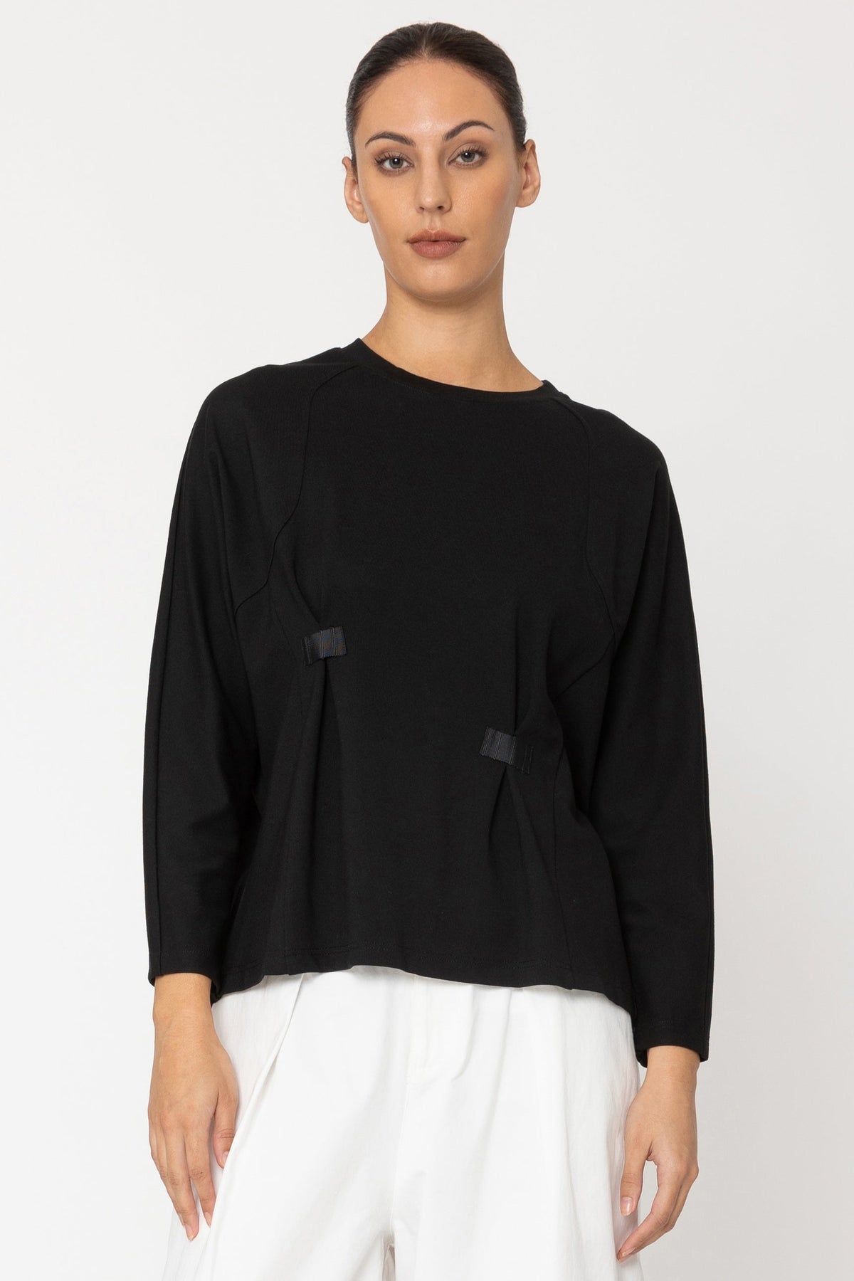• Thoughtful Design: Features raglan sleeves and two front tucks that enhance a relaxed fit while subtly defining your waist.