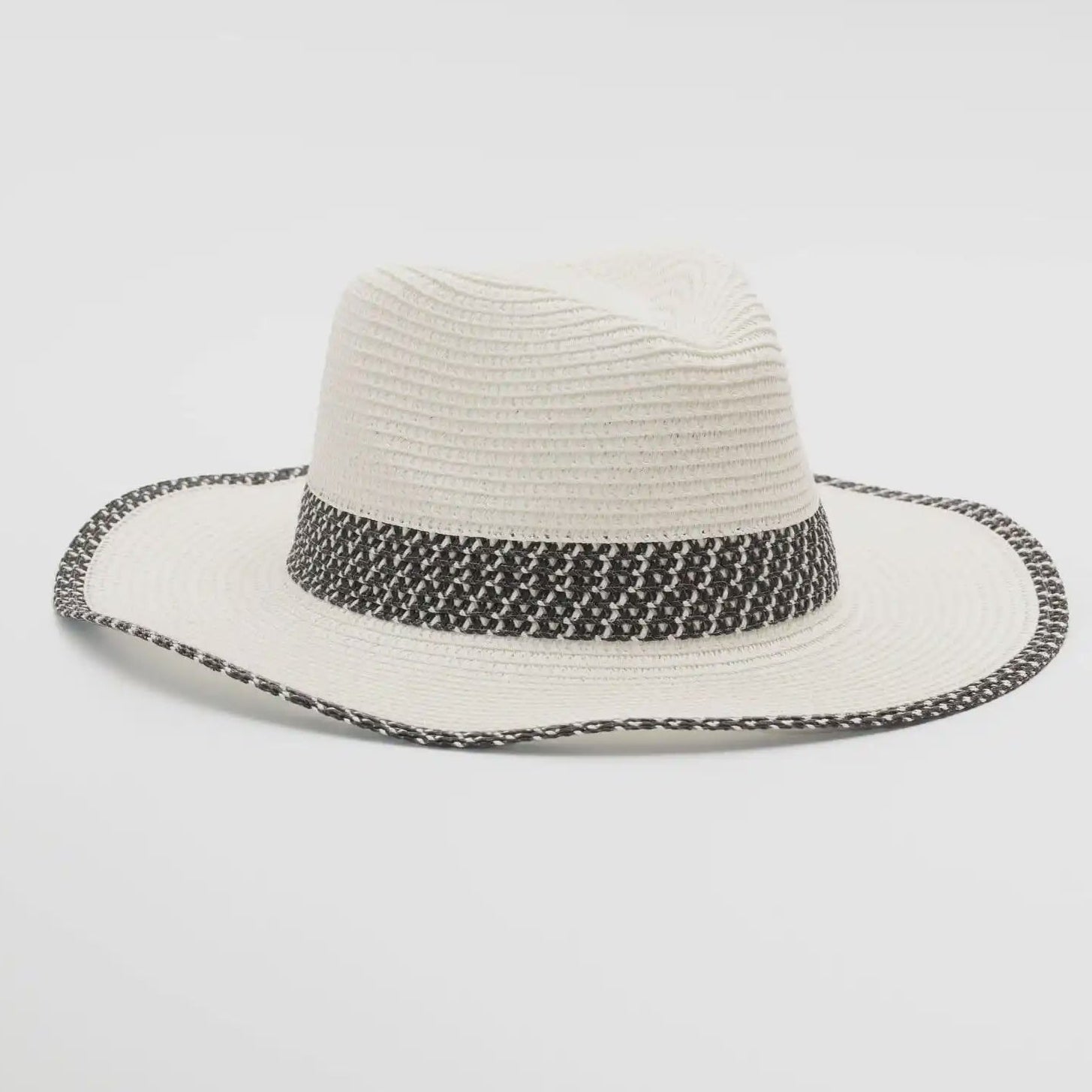 - Classic white summer fedora with chic black accents for a refined look